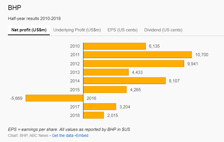 BHP made an after-tax profit of $US2.01 billion ($2.55 billion) for the six months to the end of December.